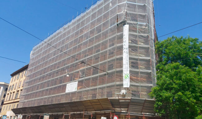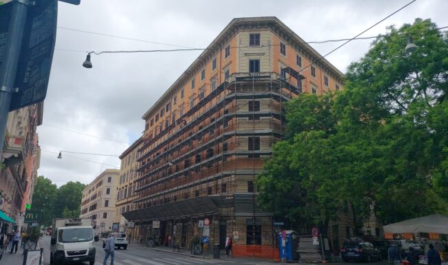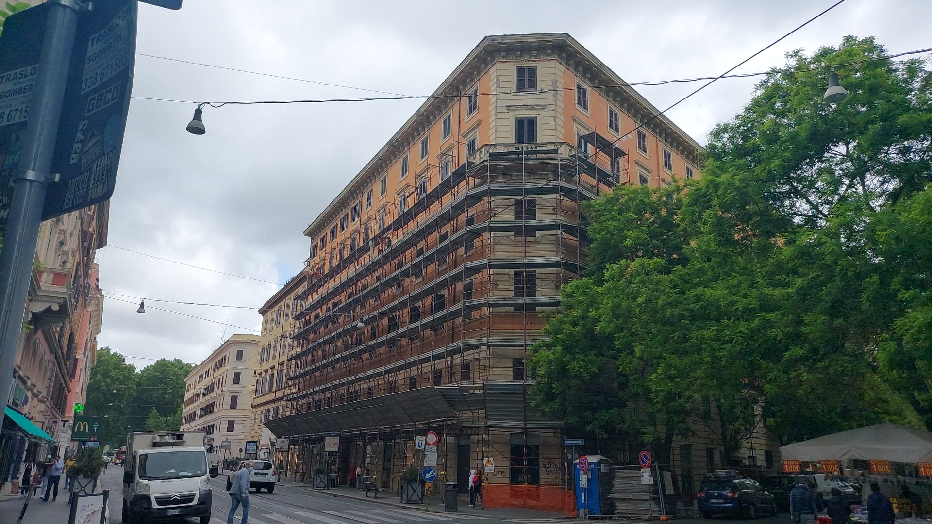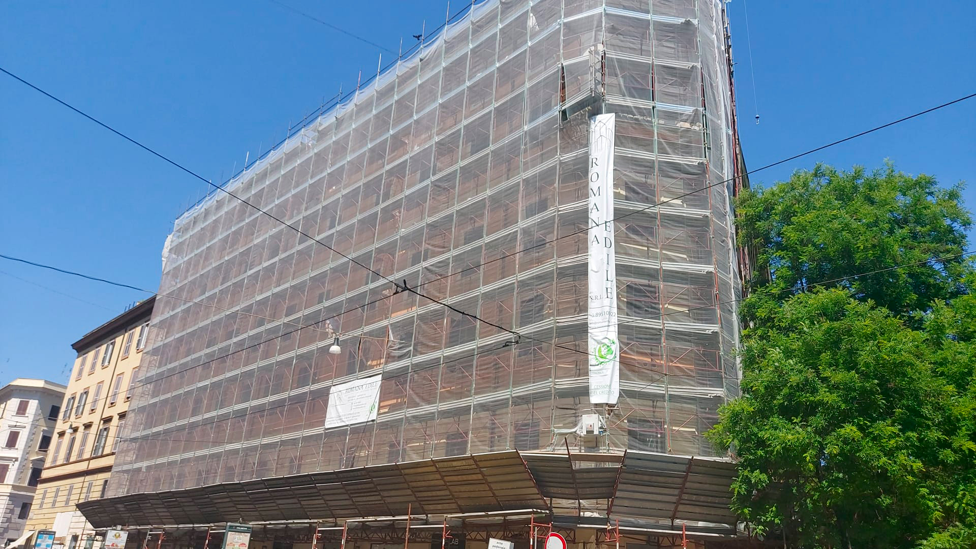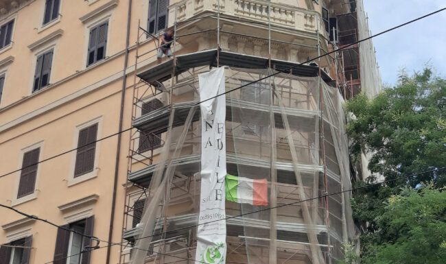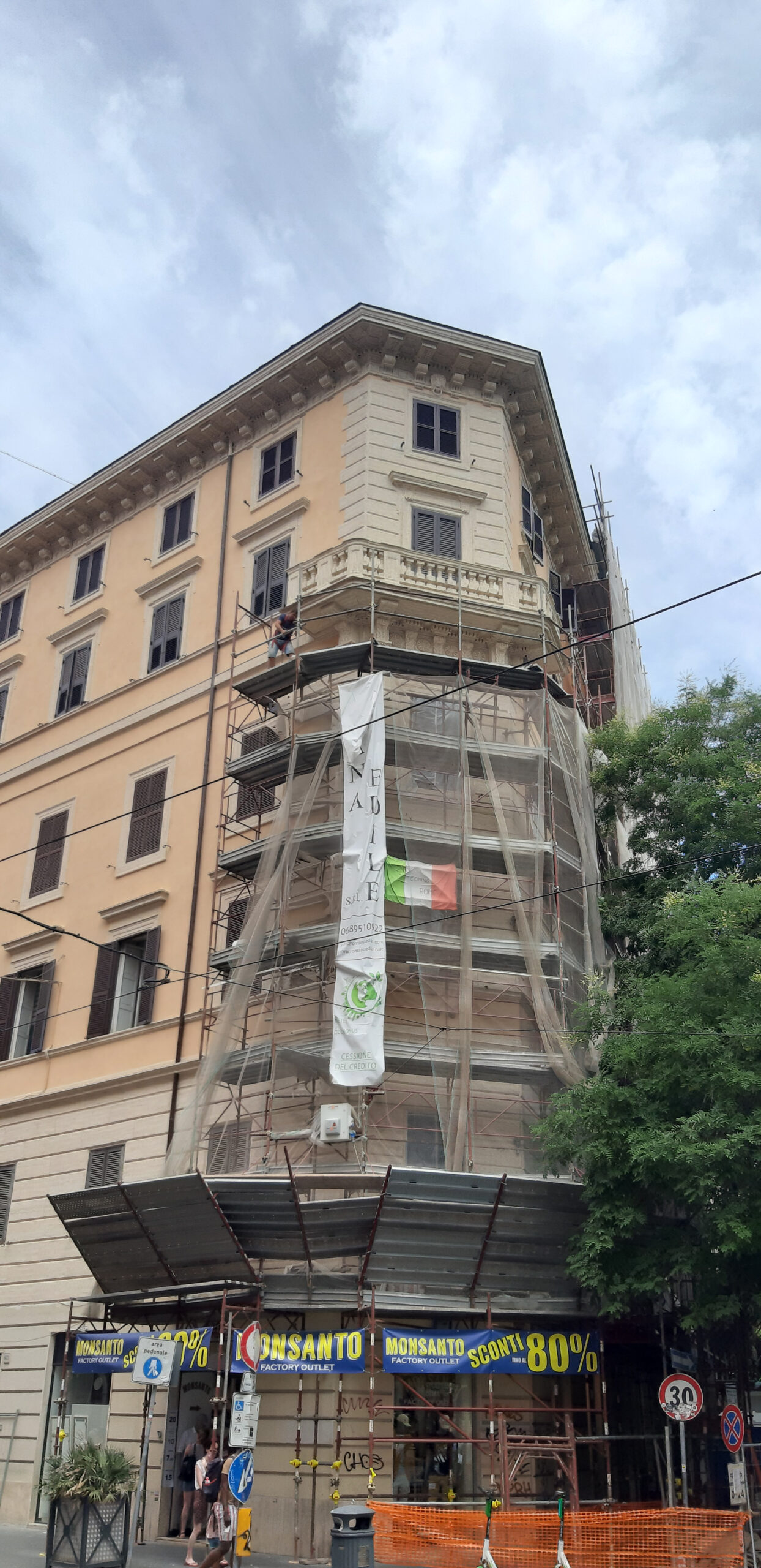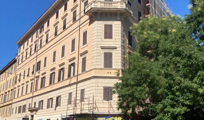 In collaborazione con la Soprintendenza Capitolina, abbiamo ripristinato la vecchia finitura di tali elementi decorativi praticando un effetto pittorico del finto travertino donando al fabbricato il vecchio splendore di un tempo. Il lavoro è stato concluso con il rifacimento della finitura della facciata del fabbricato con colore scelto della Soprintendenza.